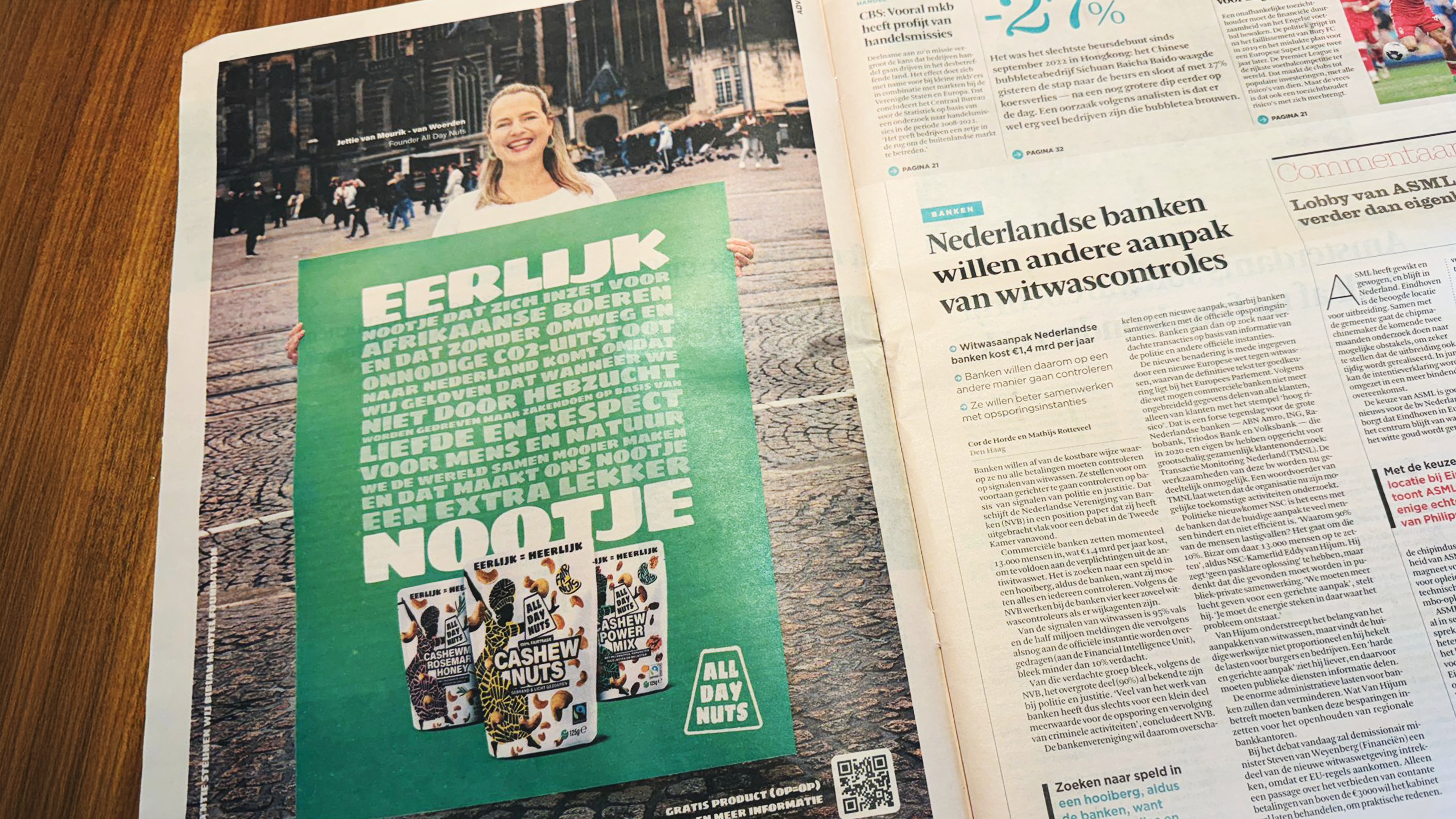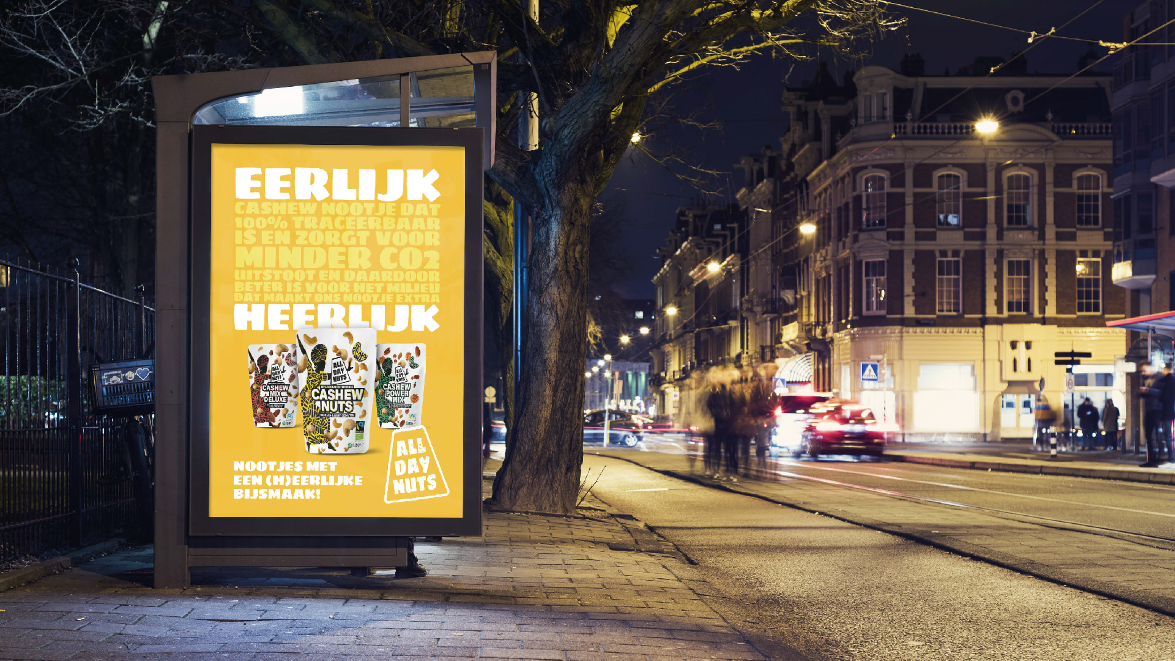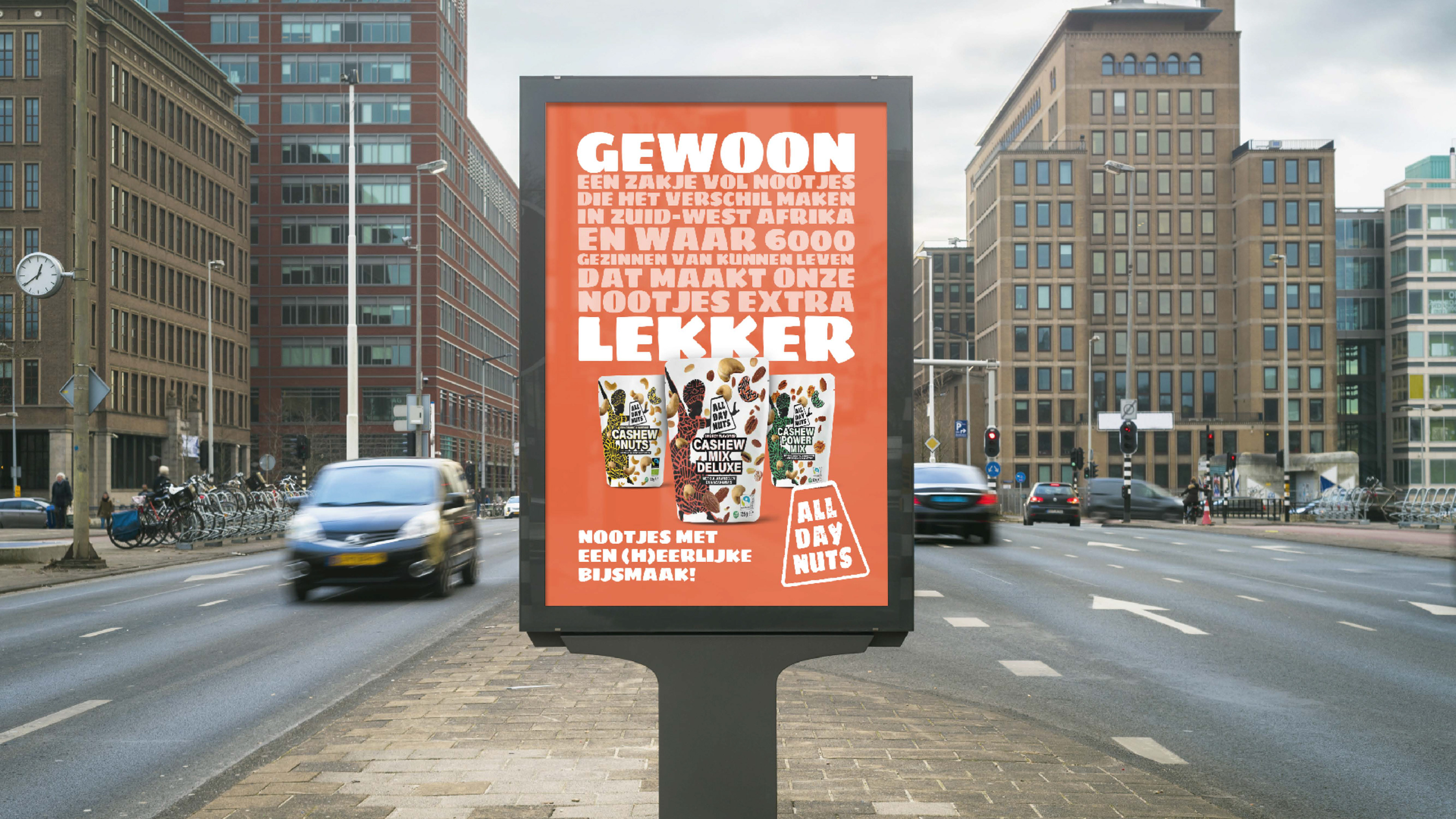 All Day Nuts strijdt elke dag om de notenindustrie te veranderen. Dat begint met het stoppen van de zinloze transporten die de meeste noten nu maken voordat ze in de winkel liggen. In plaats daarvan worden de noten verwerkt in het land van herkomst. Zo versterken we de lokale gemeenschap en zorgen we ervoor dat boeren in West-Afrika eerlijk worden beloond. Het resultaat? Een nootje met een écht (h)eerlijke bijsmaak. Al dat goede laten we bovendien subtiel doorschemeren tussen de regels door.