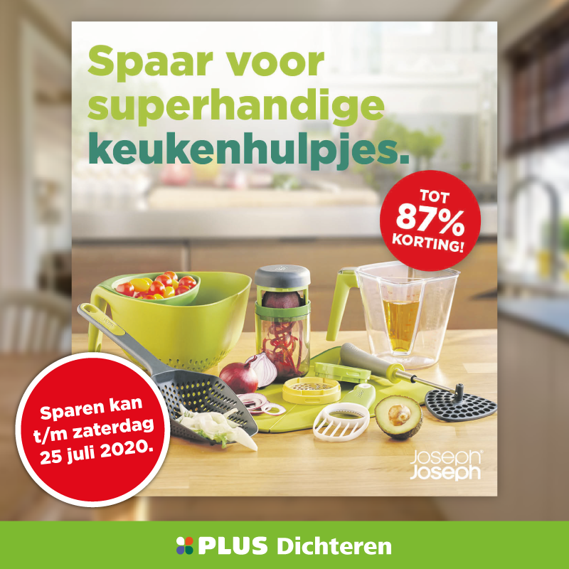 Met de PLUS Keukenhulpjes spaaractie spaarde je bij elke €5 een zegel voor slimme, multifunctionele Joseph Joseph keukentools. Een populaire actie, waarbij handige producten zoals een vouwbare snijplank, avocadosnijder en vergieten te krijgen waren.